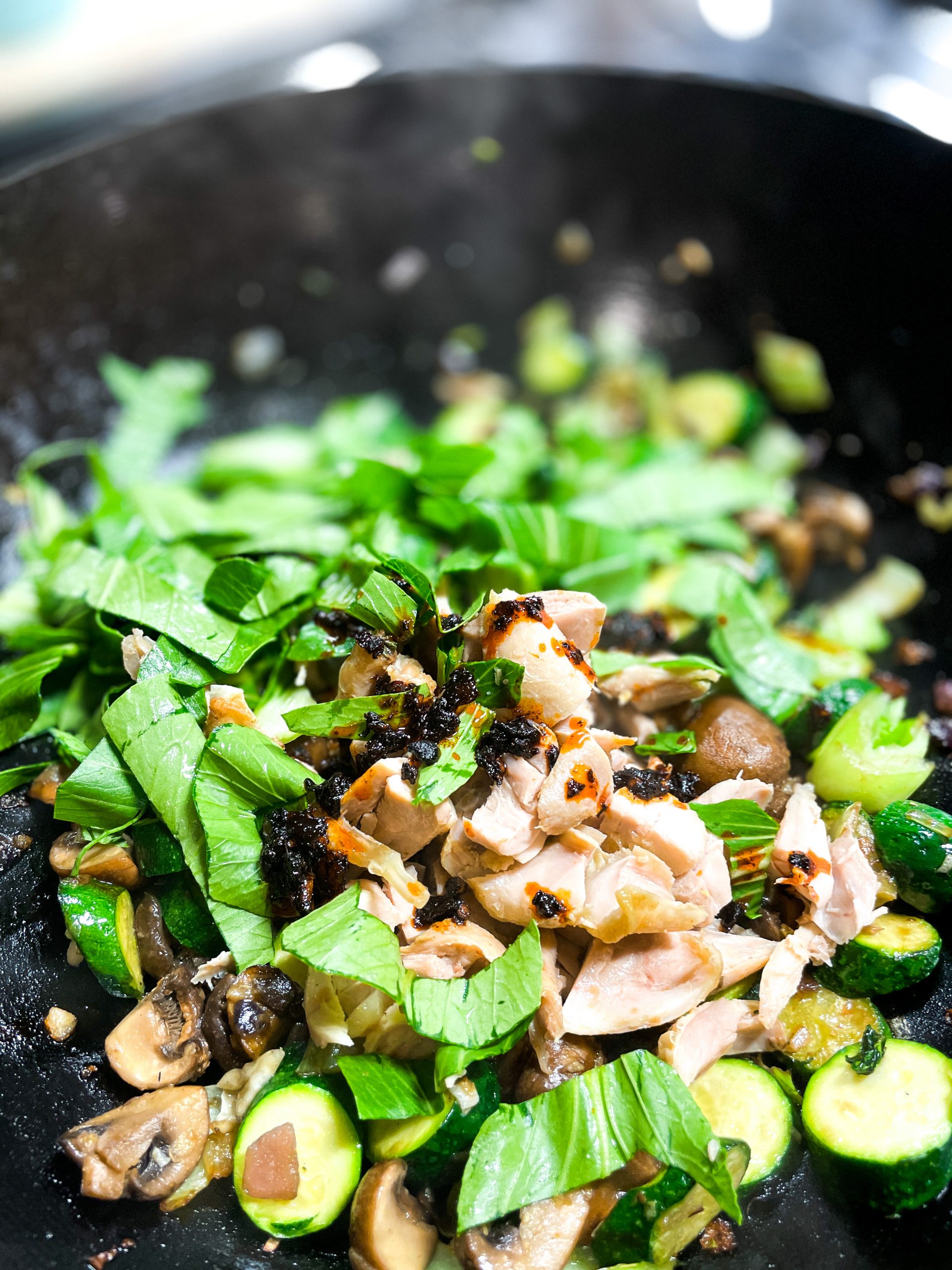 Remember that chicken hack I did on Sunday? Well here is the stir fry I did for dinner last night. If you are vegan or vegetarian you can substitute your choice of protein at the end where I add the chicken. Ideas for protein for vegans are seitan nuggets, which resemble chicken. You can also use tofu, or black beans. Have fun and make your version. You can also just leave it as is and enjoy, without the addition of any protein.