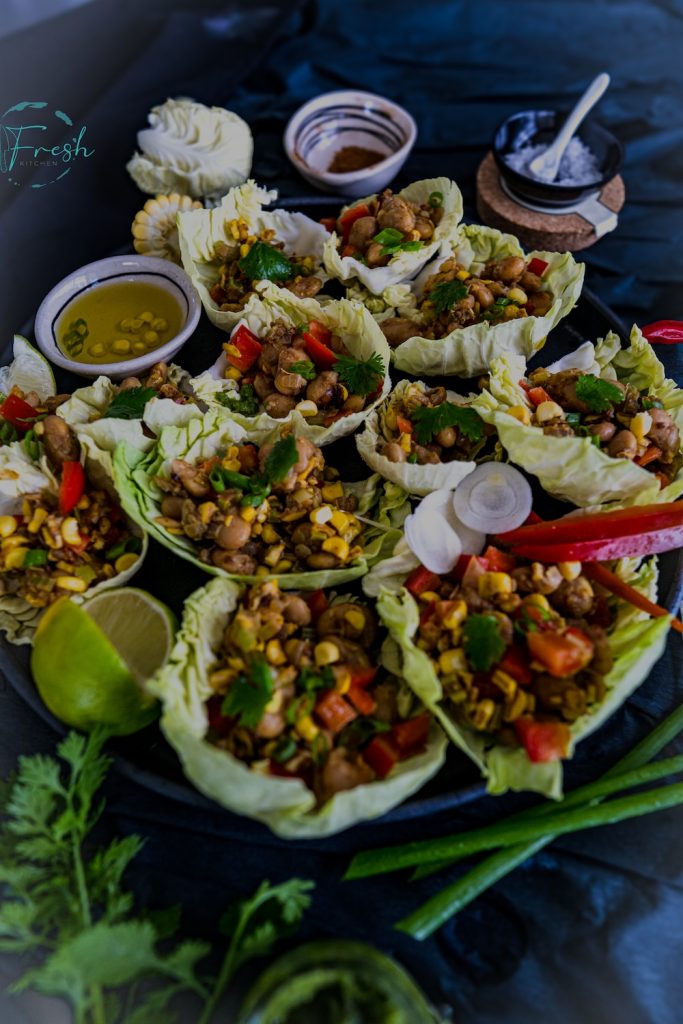 For your meat eating friends and family add pieces of grilled chicken. To make the meal stretch a little further serve in soft flour tortillas and chop the cabbage up instead of using them as cups.