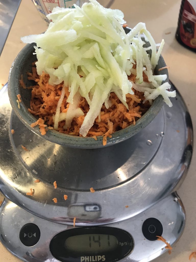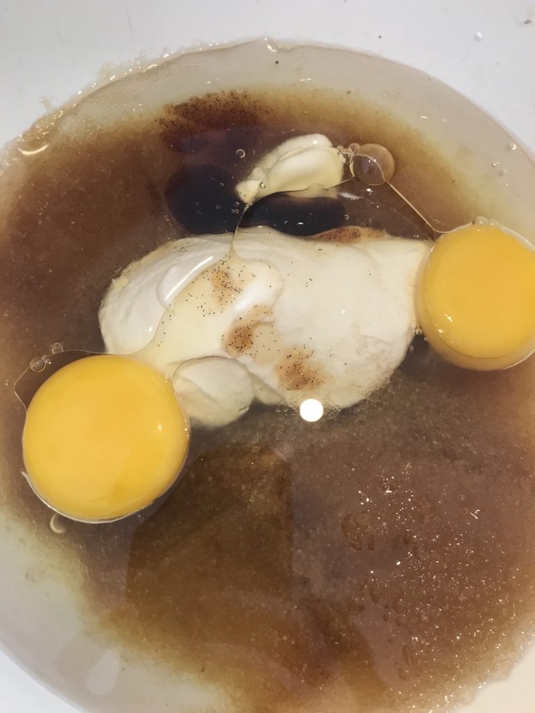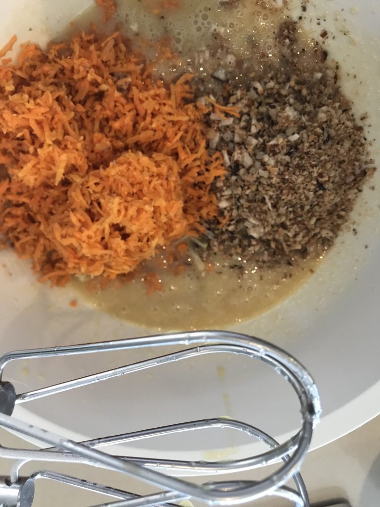 In a separate bowl add all the wet ingredients except the carrots, coconut and pecans. Beat with the hand mixer until well mixed for about 1-2 min on medium speed
