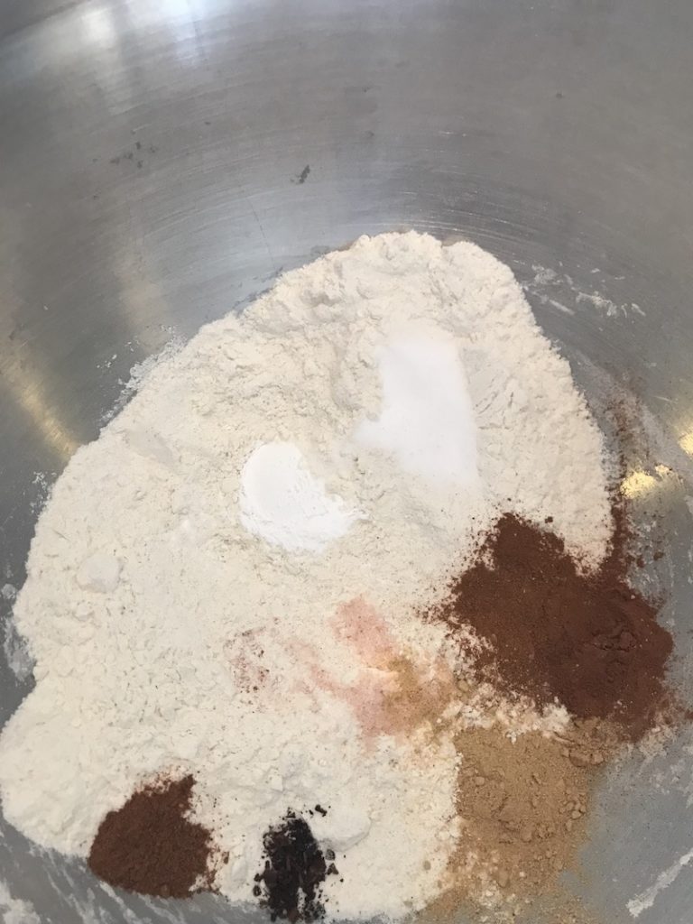 Sift all the dry ingredients into a bowl then whisk them all together to ensure they are evenly mixed and fully incorporated