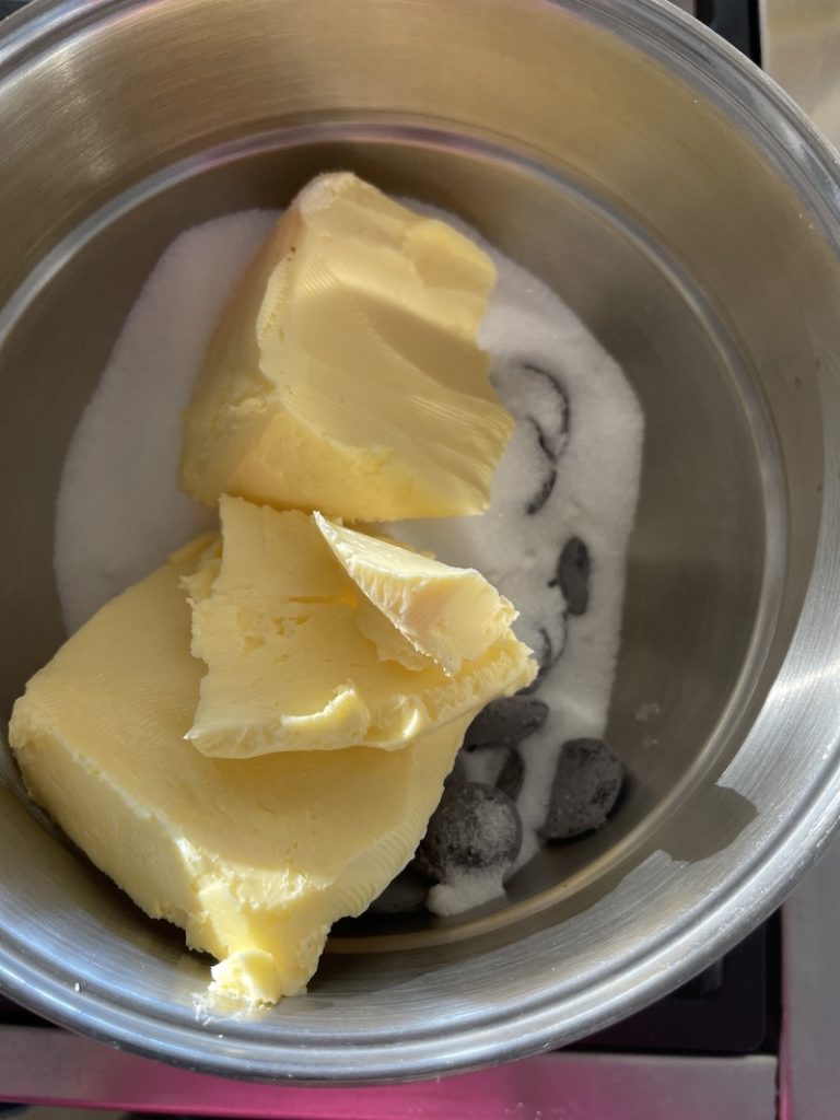 Place a bain marie over boiling water. Add the butter, chocolate and sugar to the bowl. Melt together.