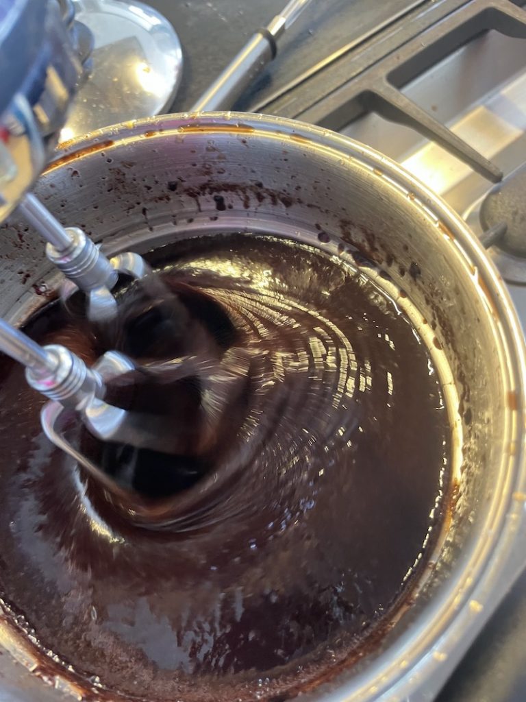 Continue to whisk while slowly and steadily adding the whisked eggs making sure they don't scramble from the heat of the choc mix Add the vanilla extract