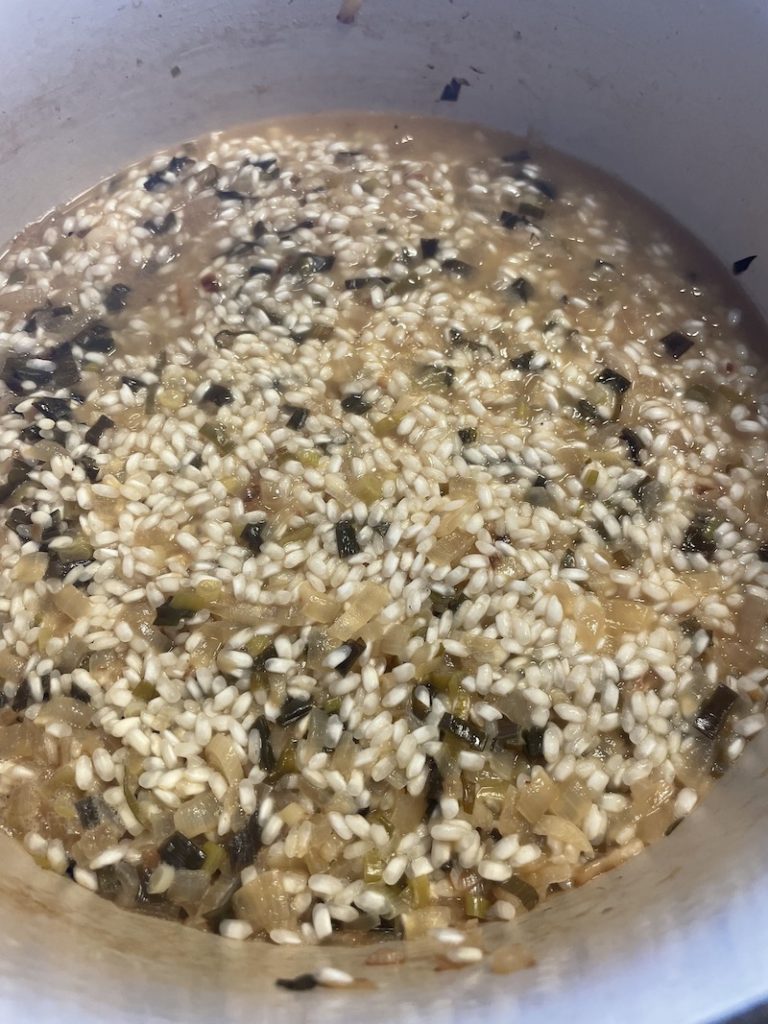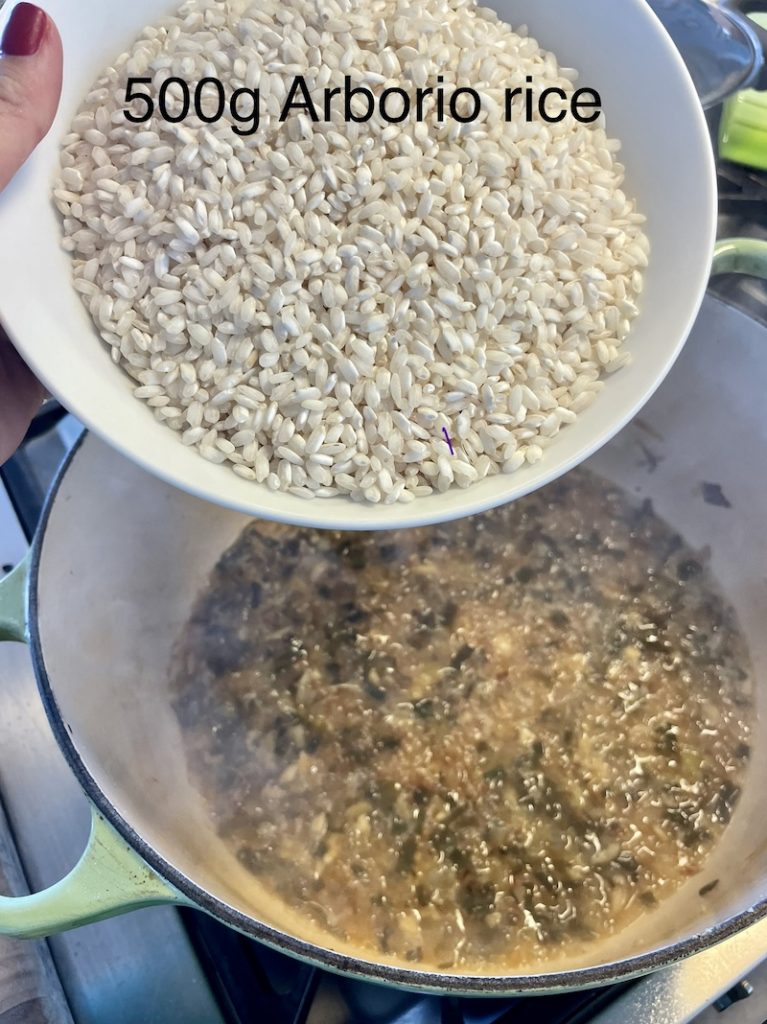 Now add the arborio rice and stir into onion mix and simmer for 2 minutes