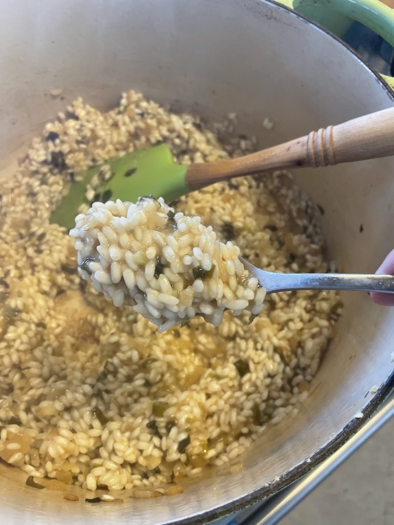 When all the stock is absorbed into the rice check the seasoning. Add salt and pepper to taste