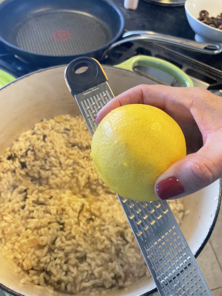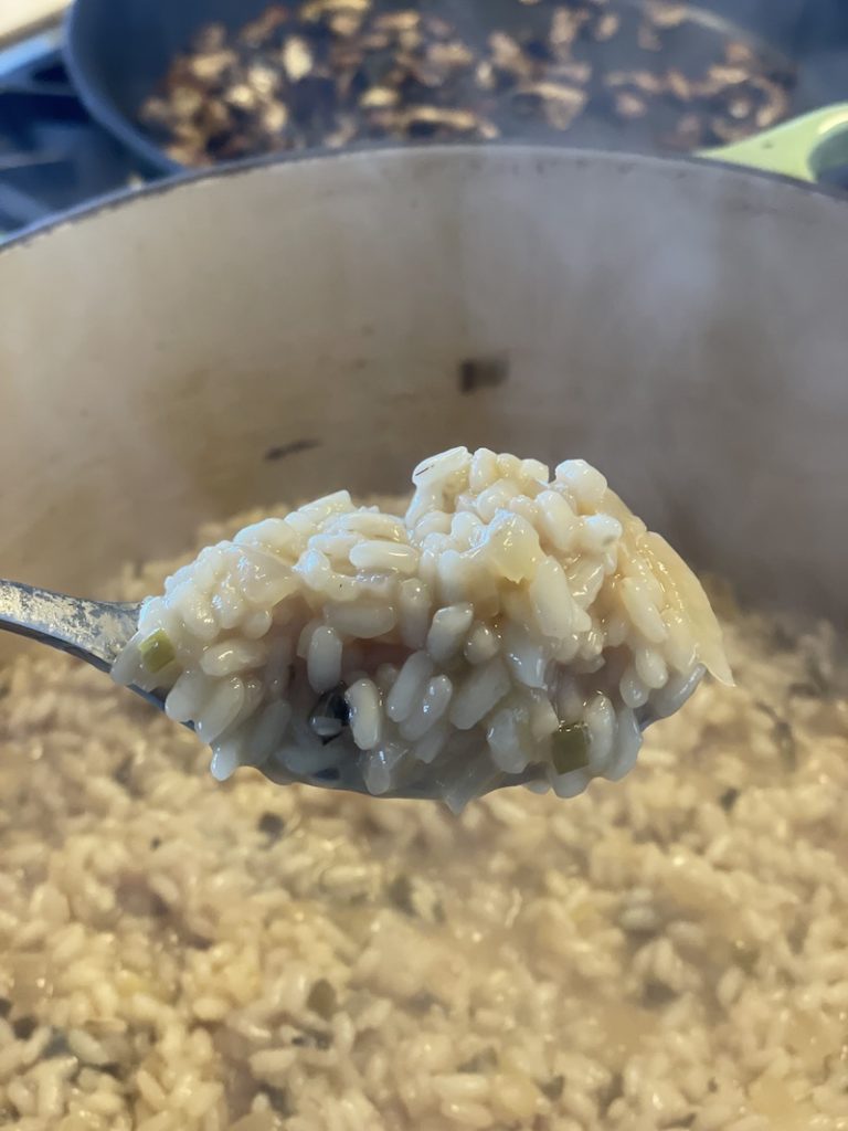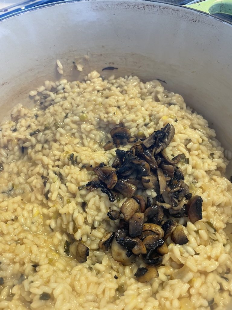 Add the extra 2 Tbls olive oil to a hot pan. Add the mushrooms, salt and pepper and cook until brown and all the water from the mushrooms has evaporated. Set aside until ready to add to the risotto