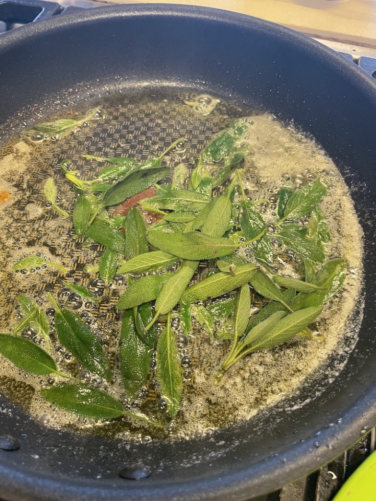 Pour in the nutty butter and half the crispy sage