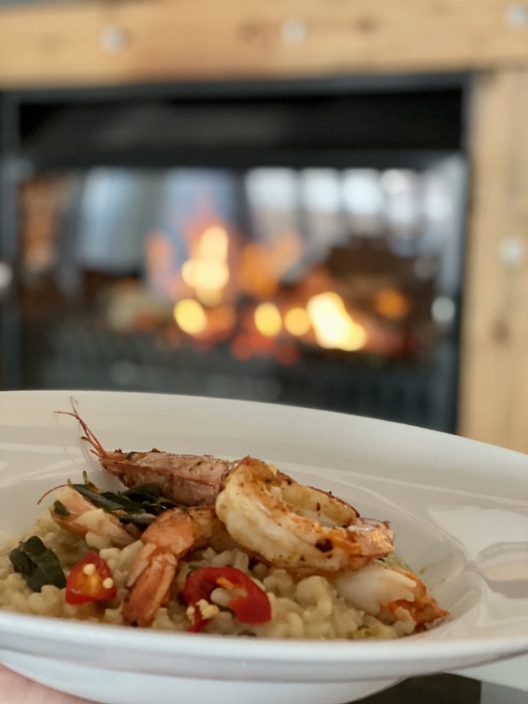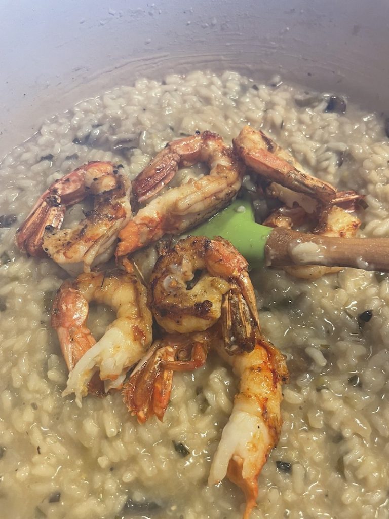 Add the grilled prawns to the risotto and reserve a few to add on top of the risotto when serving