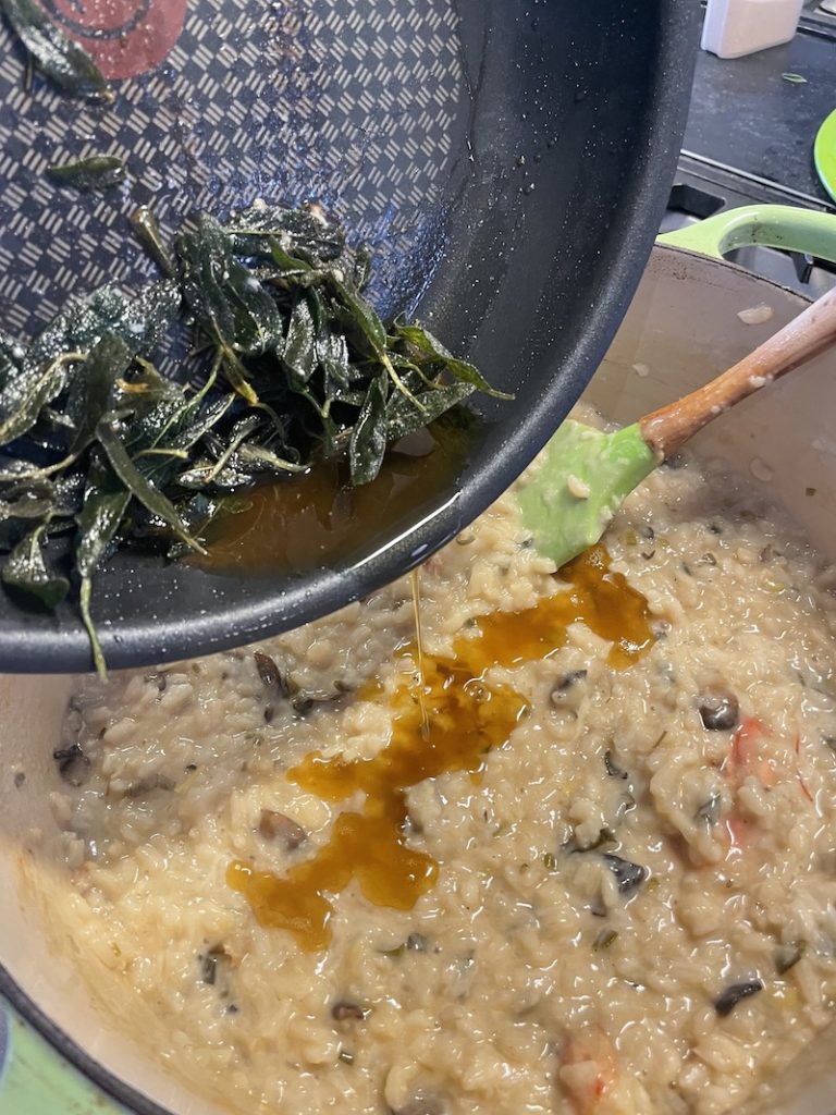 In the same pan used for the mushrooms add the rest of the butter (25g) and the sage. Cook until sage crips up and the butter is nutty brown. Set aside to garnish the risotto with when ready to serve