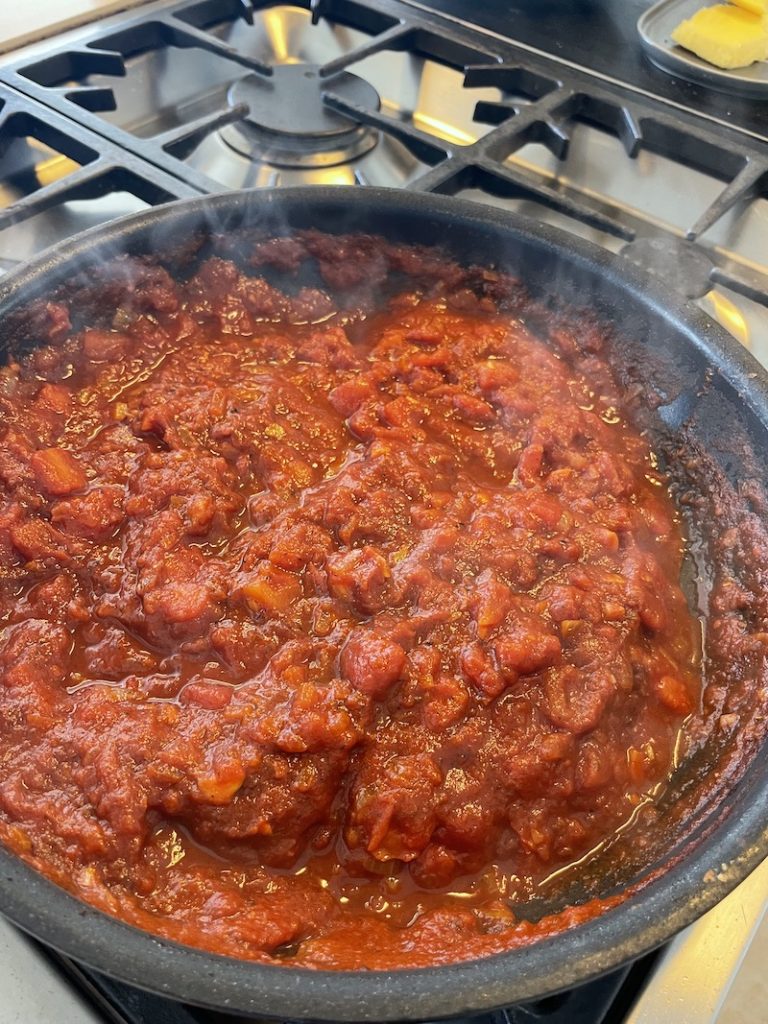 Arrange the meatballs in a ovenproof caserole dish (23cm x 23 cm). Pour over the tomato sauce