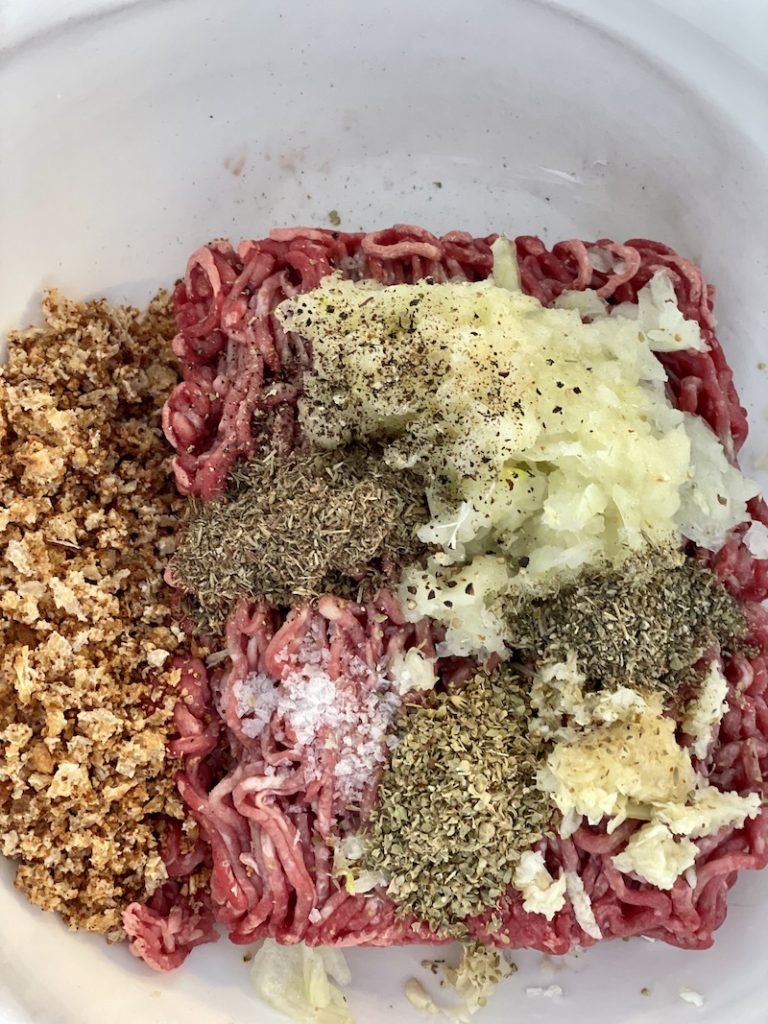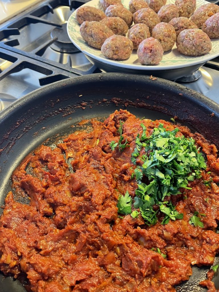 In a separate bowl add all the meatball ingredients except 2 Tbls of olive oil which will be used for shallow frying. Mix together so that all the ingredients are incorporated and well blended