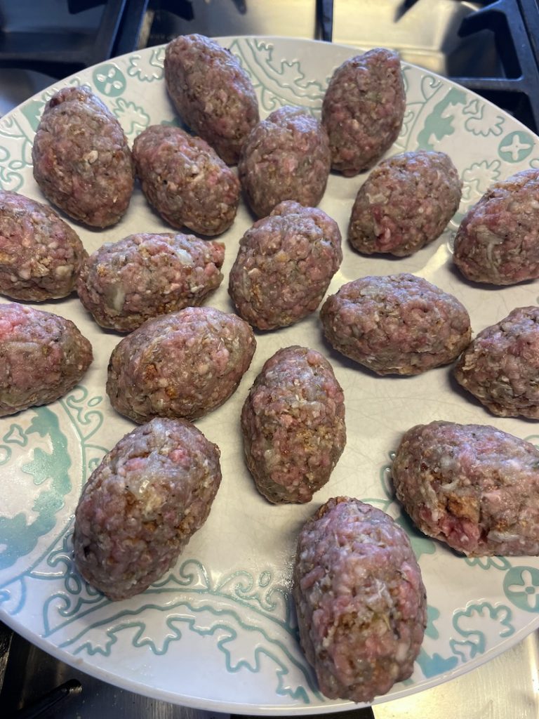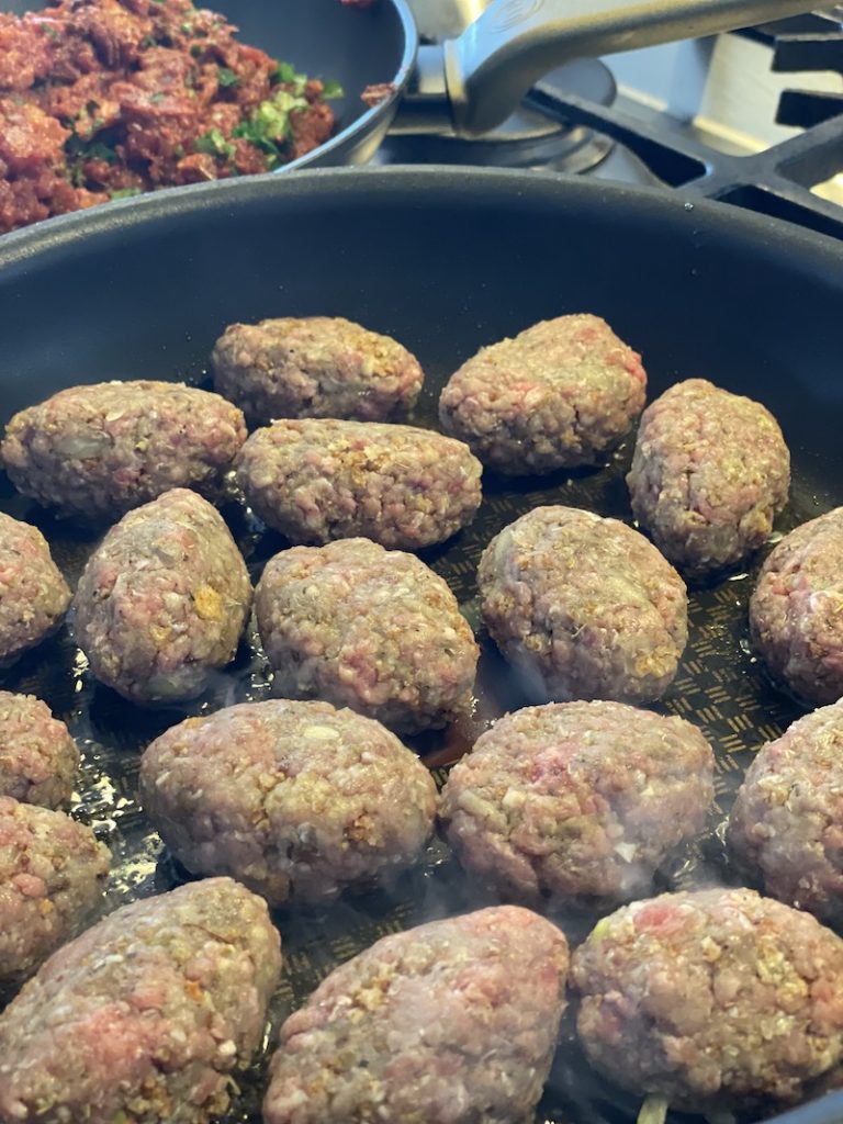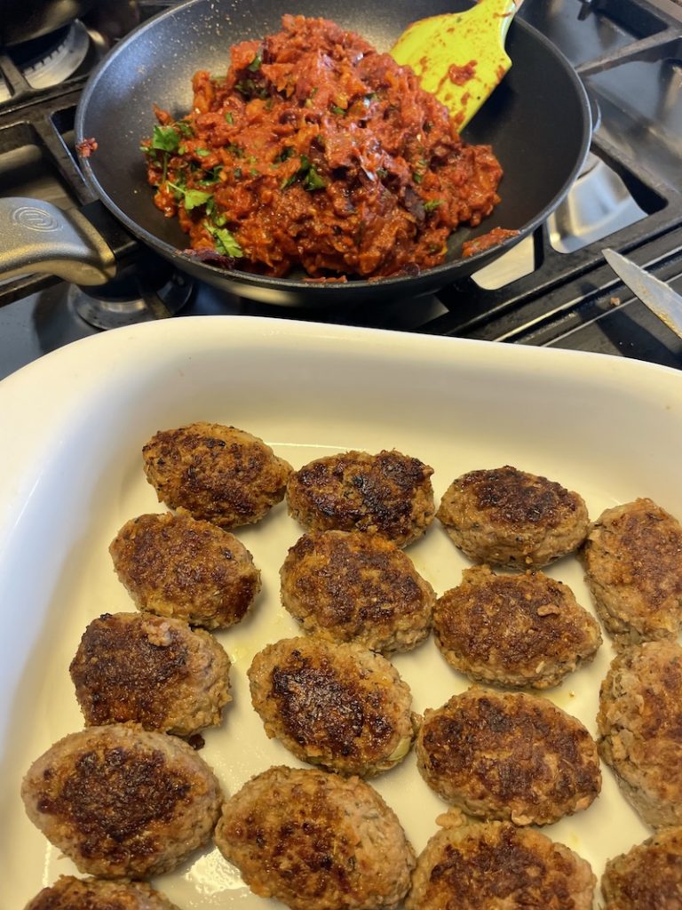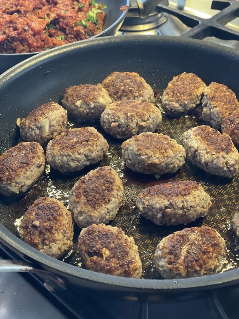 Shape meatballs into 30g-35g torpedos. You should get about 18 balls. Get the kids involved, this is how they learn. Who know's you may get them to cook the entire meal for you in the near future. This meal will serve 4 portions very generously. Sarah and I would have about 3 meatballs each and Brian would have 4. We always had the rest for lunch the next day.