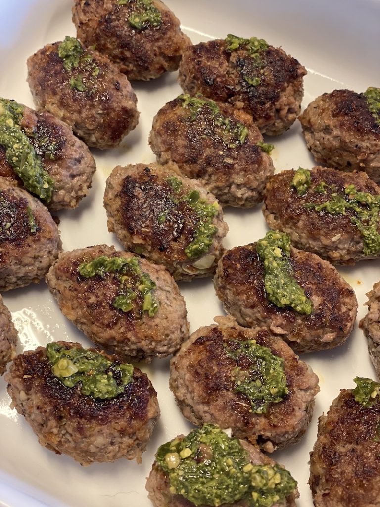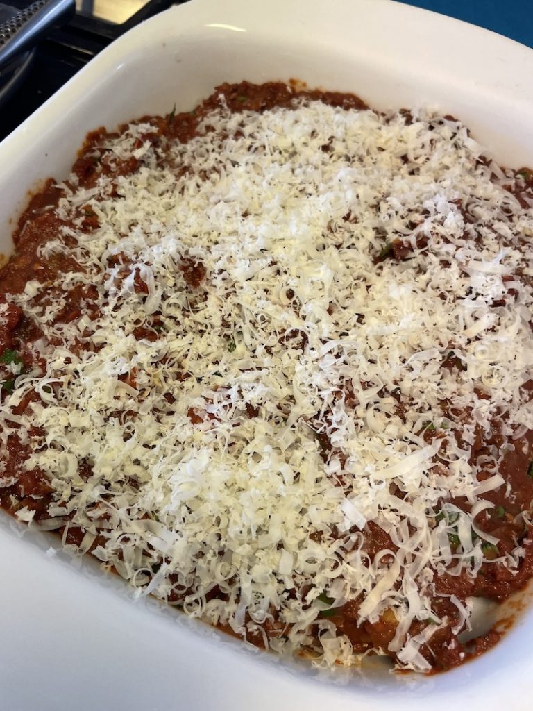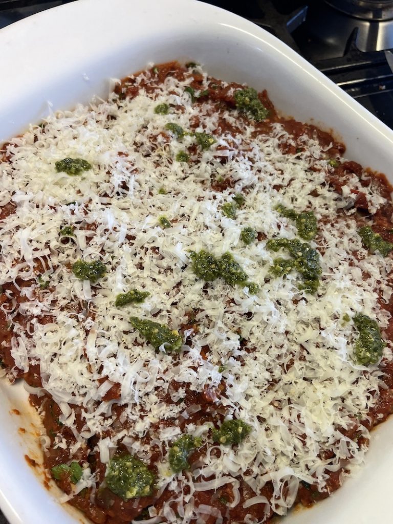 Pour sauce over meatballs. Grate cheese over top and dot with pesto if you like, yes again! Mozzarella also works very well. It's more cheesy and stringy and stretchy and kids love it no
