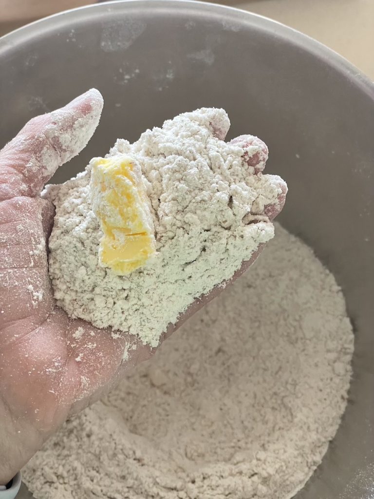 In a bowl whisk the salt, sugar, flour and dry instant yeast together. Rub in the butter until it resembles fine breadcrumbs.