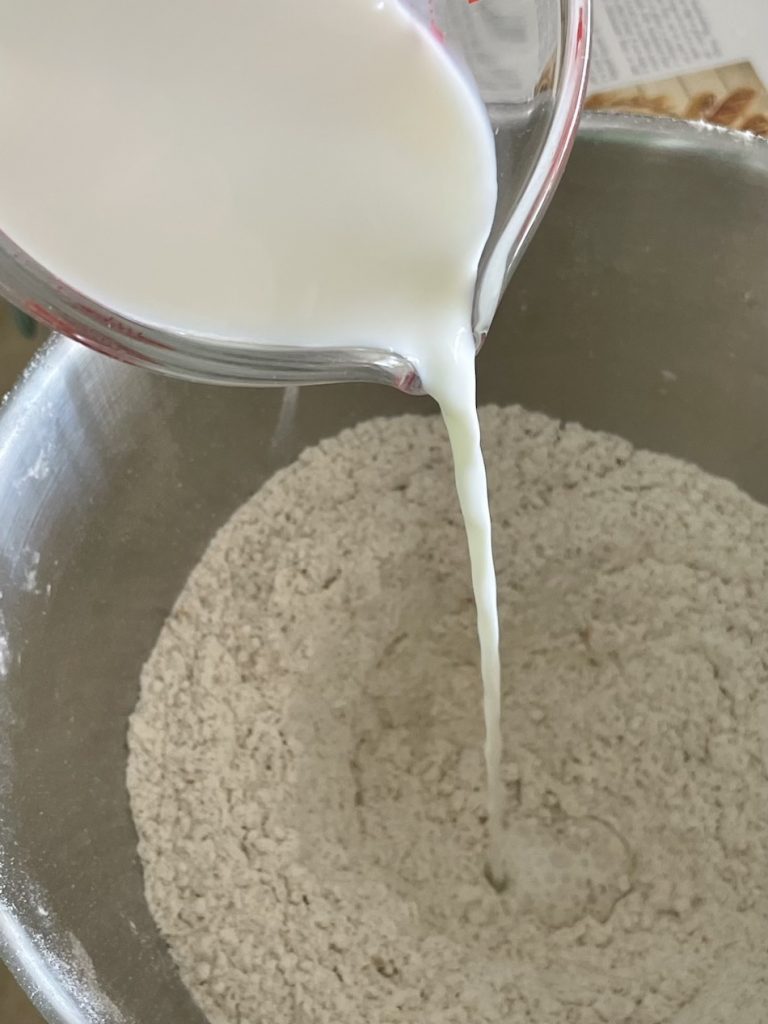 Make a well in the center and add the tepid milk and 150ml water. Mix together until dough comes together loosely. Add extra 20ml of water if dough feels dry