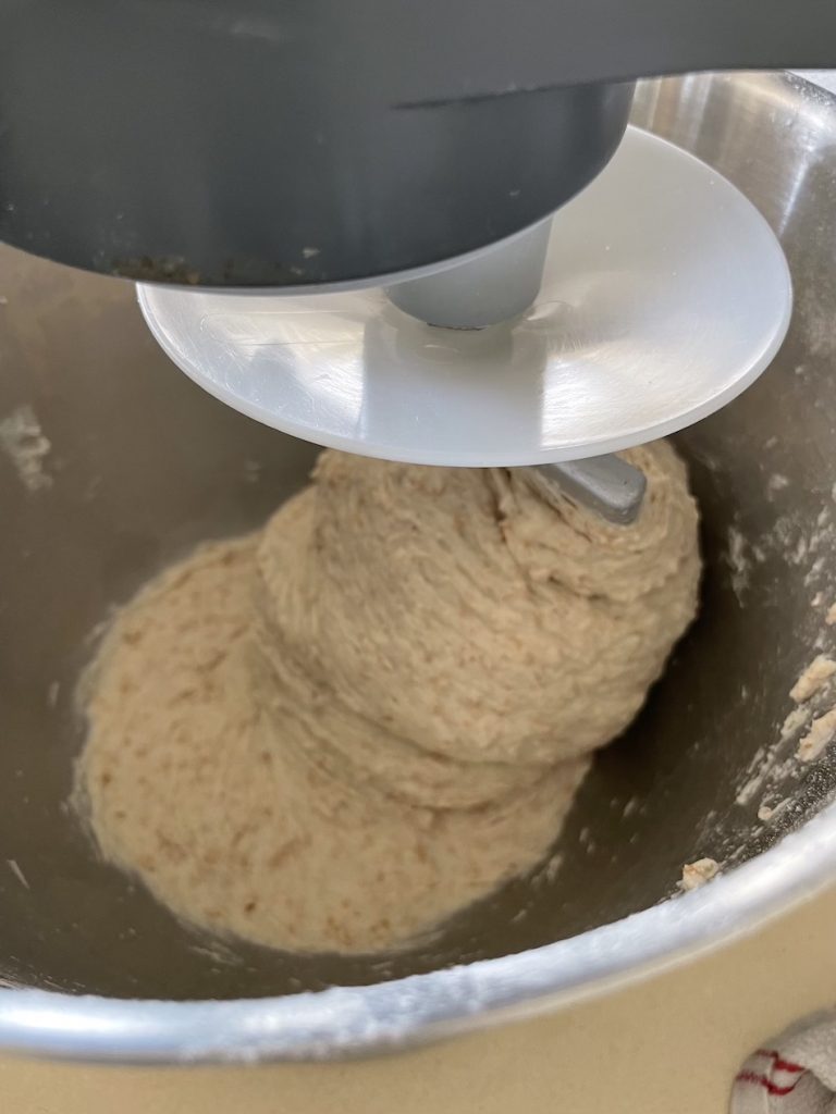 Knead in Kenwood mixer on very low speed for 5 - 6 minutes. Or tip dough onto counter and knead for about 10 minutes.