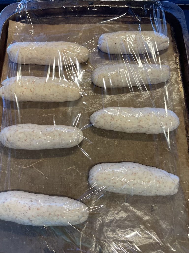 Then roll into hot dog rolls by flattening and rolling into about 16cm long strips. Place the rolls onto a tray lined with baking paper cover loosely with cling wrap it a damp tea towel and leave to proof for 45-60 min. They should puff up and spread out during the second proofing.