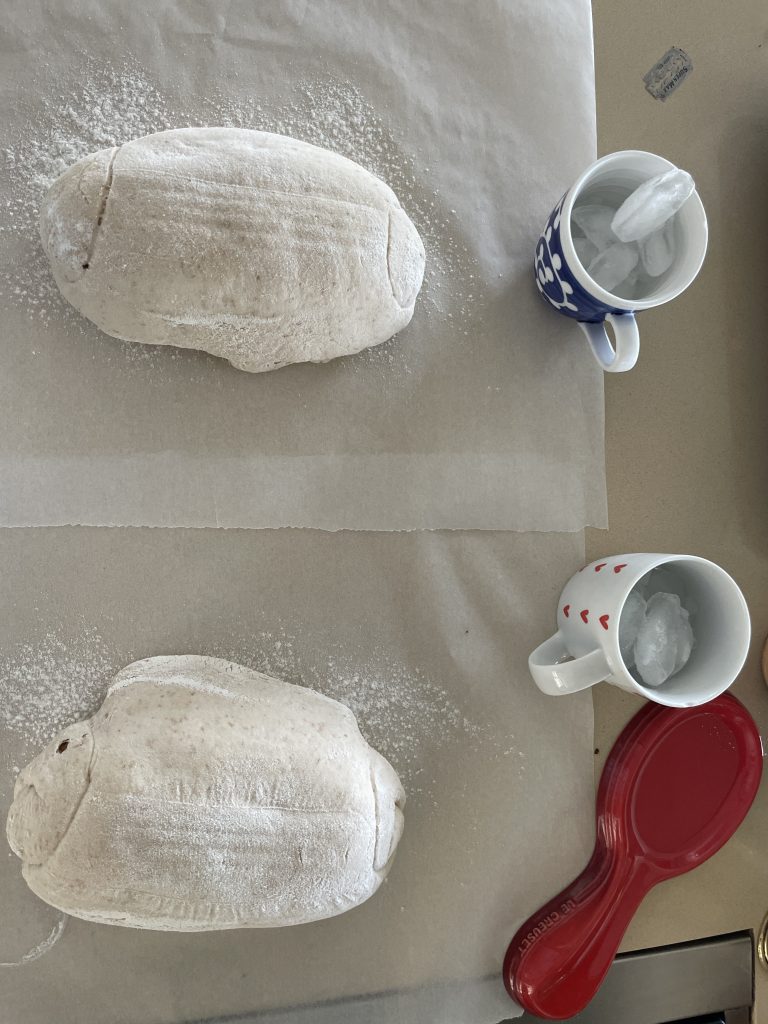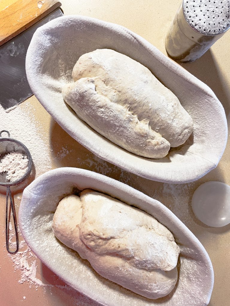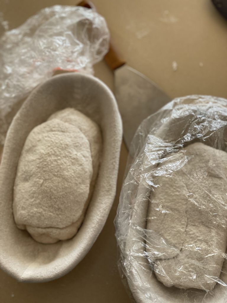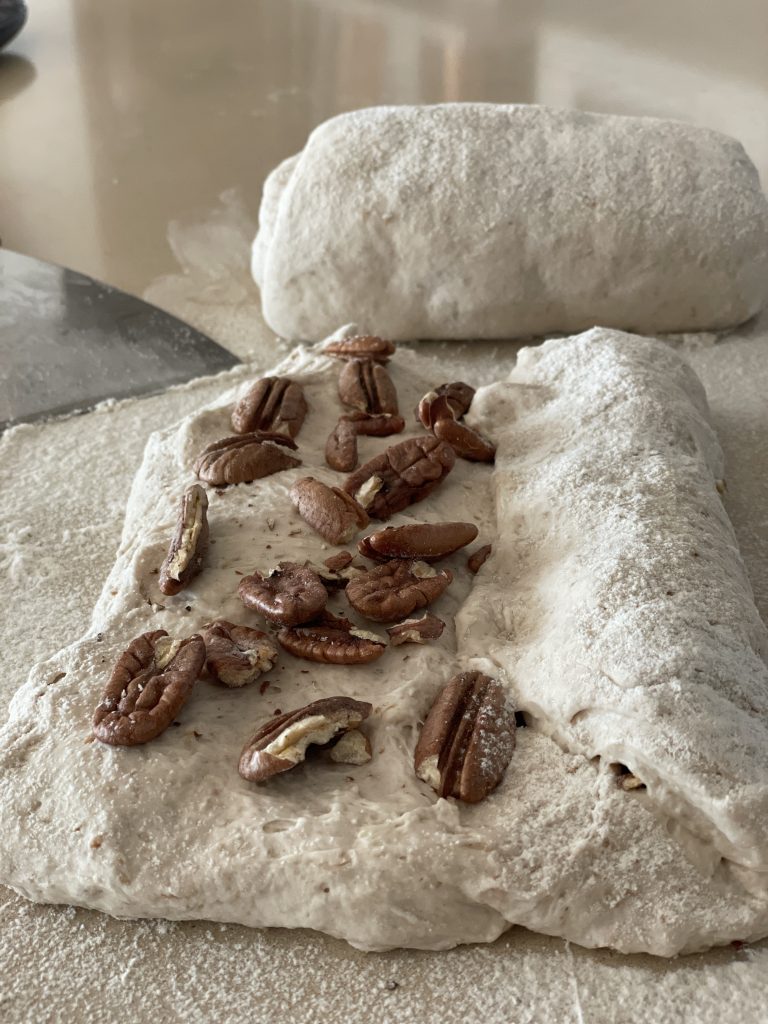 Then put in fridge overnightThe next morning tip dough onto floured work bench sprinkle with pecans and shape. Place in bannetons ( I scaled my recipe to get two loaves here by 1.5)