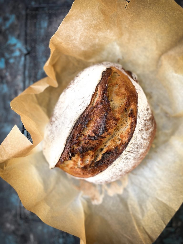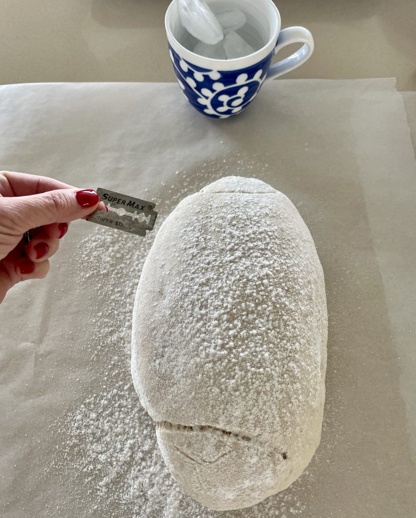 After 45 min the oven should be at temperature. Have about 6 ice blocks at the ready. Turn the loaf out onto baking paper sprinkled with rice flour. Score the loaf and gently place into hot dutch oven. Add the ice blocks to the pot behind the paper place the lid on quickly to trap in the steam. Turn the oven down to 230℃ and bake for 30 minutes.