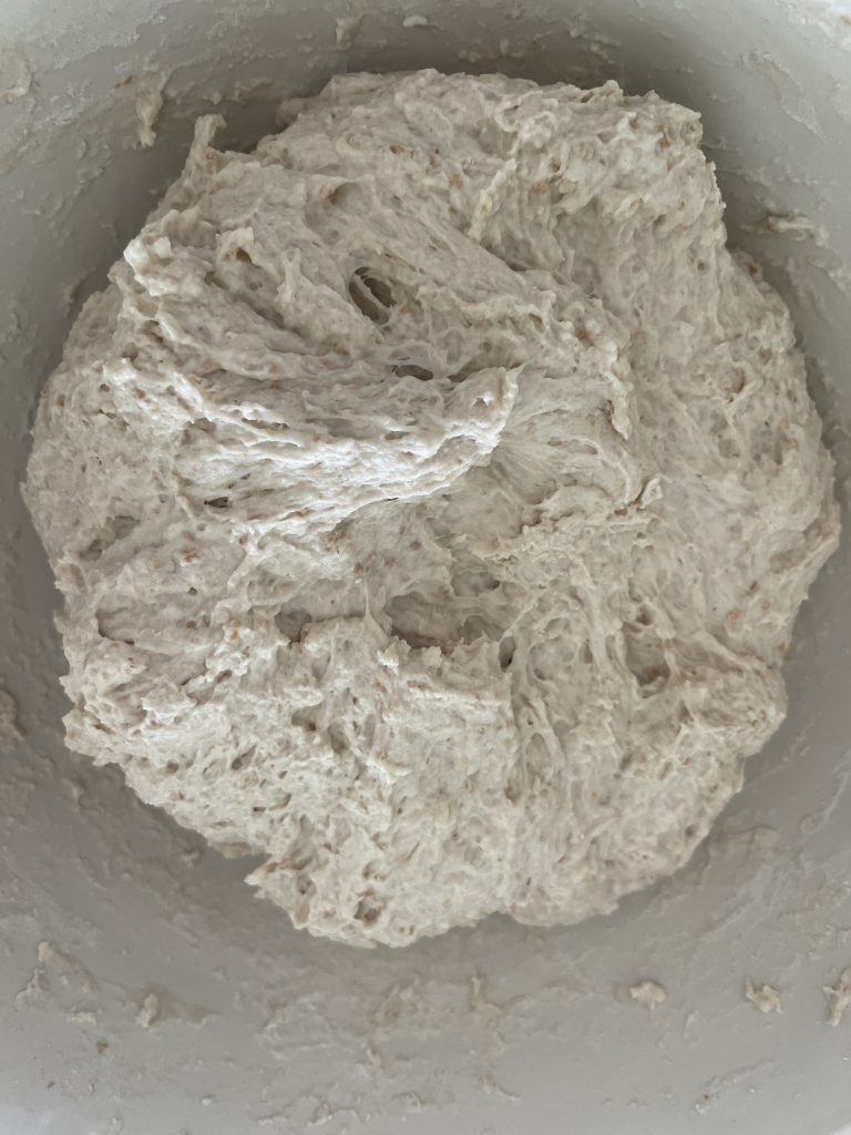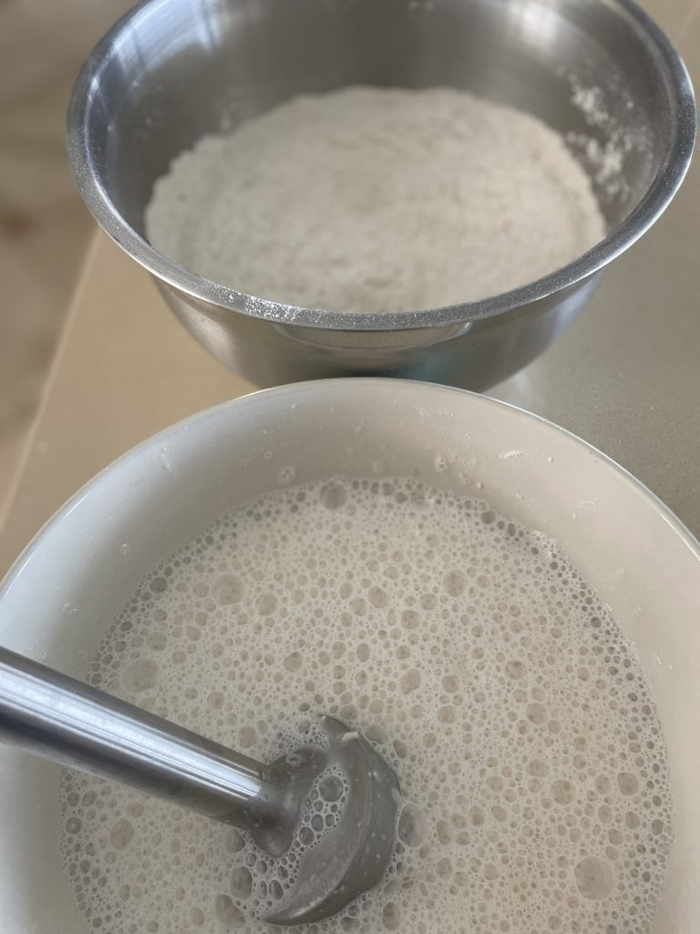 After 15 minutes blits the water and sourdough together with a stick blender until frothy