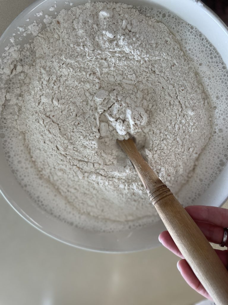 Pour the sourdough water mix into the flour mix and using a wooden spoon or spurkle mix together.